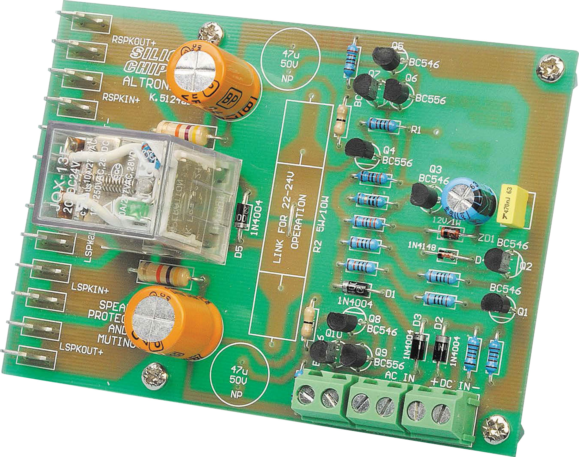 (Silicon Chip Magazine Oct’11)Loudspeaker Protector board for K 5165 135W Ultra Low Distortion Amplifier. Protects your speakers and amplifier from short circuits, Over temperature and DC faults that can occur. This kit operates with other amplifier kits in the range as well as the K 5165. Important Note For Kit Buyers: This product is supplied in component form and requires soldering, drilling, and assembly. We recommend users are familiar with at least basic electronic principles and have the ability to solder.