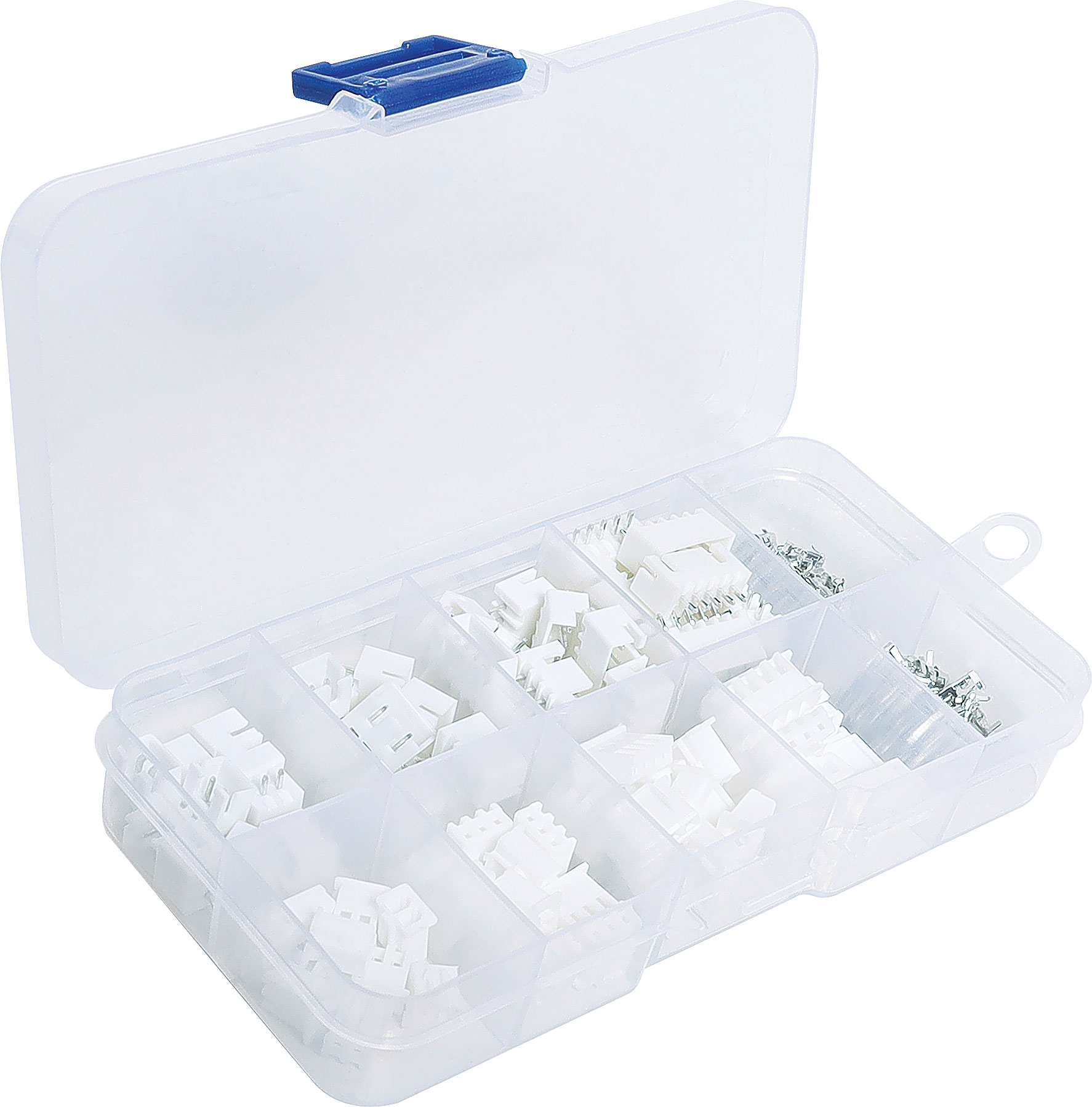 An assortment of straight pin boxed PCB connectors and matching plugs in 2, 3, 4 and 5 way varieties (10 of each plug and socket). Plus crimp pins to suit plug housings. 150pcs total.