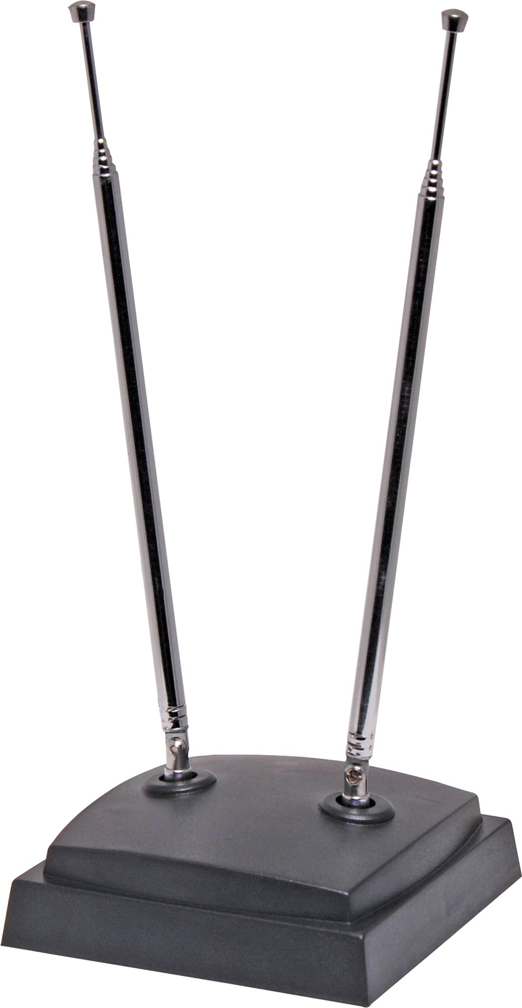Indoor dipole TV antenna with heavy duty base. 1m 75Ω coaxial lead with moulded PAL connector. The two antennae can be independently rotated allowing the rabbit ears to be set for the clearest reception you can get. The heavy base provides stability and ease of mounting, four suction cups are added for further stability.