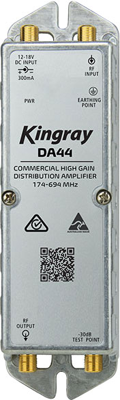 Kingrays DA44 distribution amplifier has been designed to suit the digital television environment of today and well into the future. The technology used is hybrid bipolar and GaAs, which allows for a greater output capacity, whilst having a lower noise figure. The amplifiers contain mid-stage gain controls, a number of flexible powering options and are built in a fully shielded die-cast housing. TThe DA44 is an F Type distribution amplifier designed for a separate VHF or UHF antenna or a combined antenna at the input. The DA44 can be remotely powered to and through the input. Please Note: This amplifier does not come with a power supply. The recommended power supplies are PSK18M or PSK182F. See related below. In the box DA44 Amplifier Instruction Manual Mounting Screws