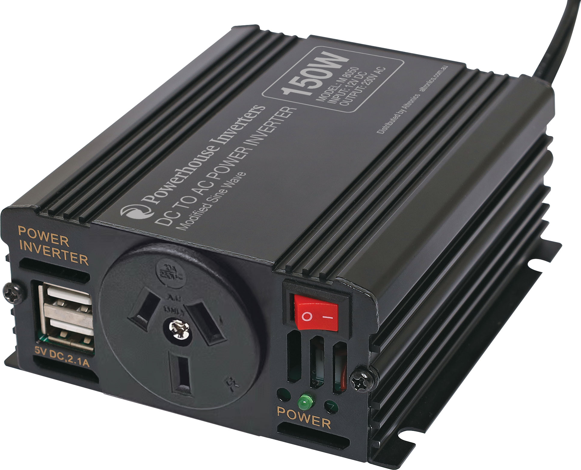 This compact 150W modified sine wave power inverter is ideal for providing AC power to appliances whilst away from mains power. They connect to your vehicle or auxiliary battery and provide AC power for appliances such as laptop chargers, stereos, phone chargers and other low wattage mains appliances. This range has been designed with operational safety in mind and is protected against over voltage, over load, over temperature, reverse polarity and short circuit conditions. A USB port is provided on the connection panel for convenient recharging of devices without the need to plug in your AC charger. Each model is housed in a robust aluminium extruded case.