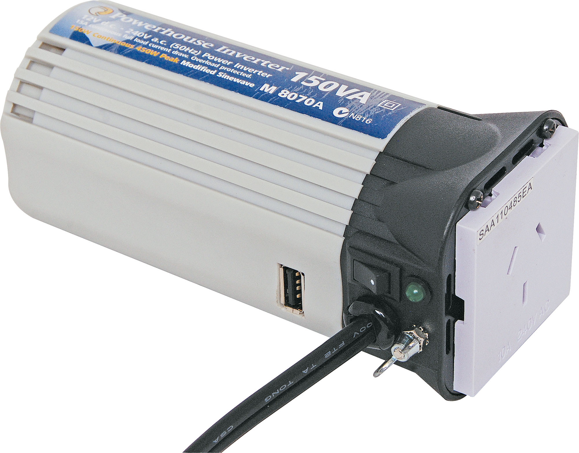 This compact 150 Watt 12V DC to 240V AC mains power inverter mounts snugly in your vehicle cup/drink holder. It''s ideal for powering laptops, lights, small tools etc. Features a USB output for charging smartphones, and tablets. All Powerhouse inverters have galvanically isolated input and output ensuring safer operation at all times. They also feature a range of protection features against reverse polarity connection, short circuit, output overloading and over temperature conditions. Fitted with car accessory plug and 0.7m lead.