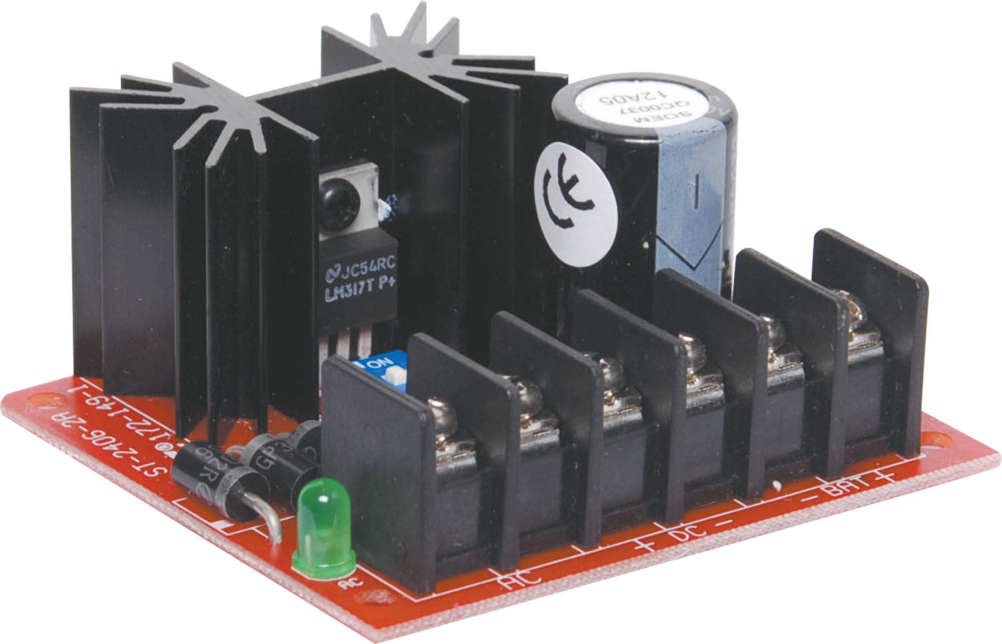 These modules are a complete regulated power supply and battery charger in one compact package. With the appropriate transformer they can be configured to deliver either 6V, 12V or 24V DC. Voltage selection is via an on board DIP switch. Both models inco