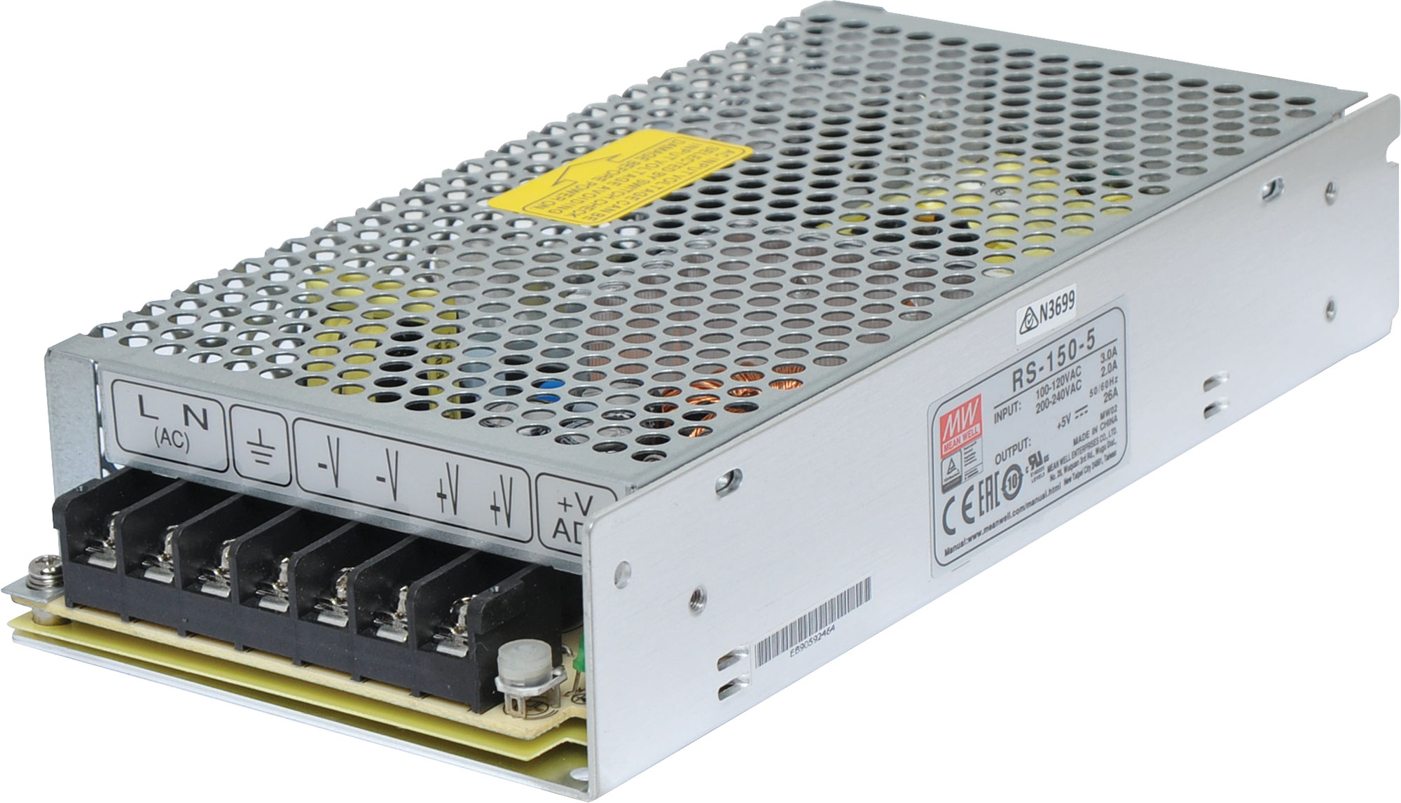The Mean Well RS-150-5 has a rated output of 130W at 5V DC. This range of switch mode power supplies offer high efficiency DC power in a compact enclosure. They are designed to be installed within a secondary cabinet as the 240V input terminals are exposed. The mesh casing allows free air cooling without the need for fans (-25° to +70°C working temperature). The low profile casing makes them ideal for mounting into 1RU rack cases. Switch mode power supplies offer several significant advantages over traditional linear transformer power supplies. They are far more efficient than their linear counterparts. As they do not use power or mains transformers the equivalent power supply weighs considerably less than traditional types. Physical size is also reduced.