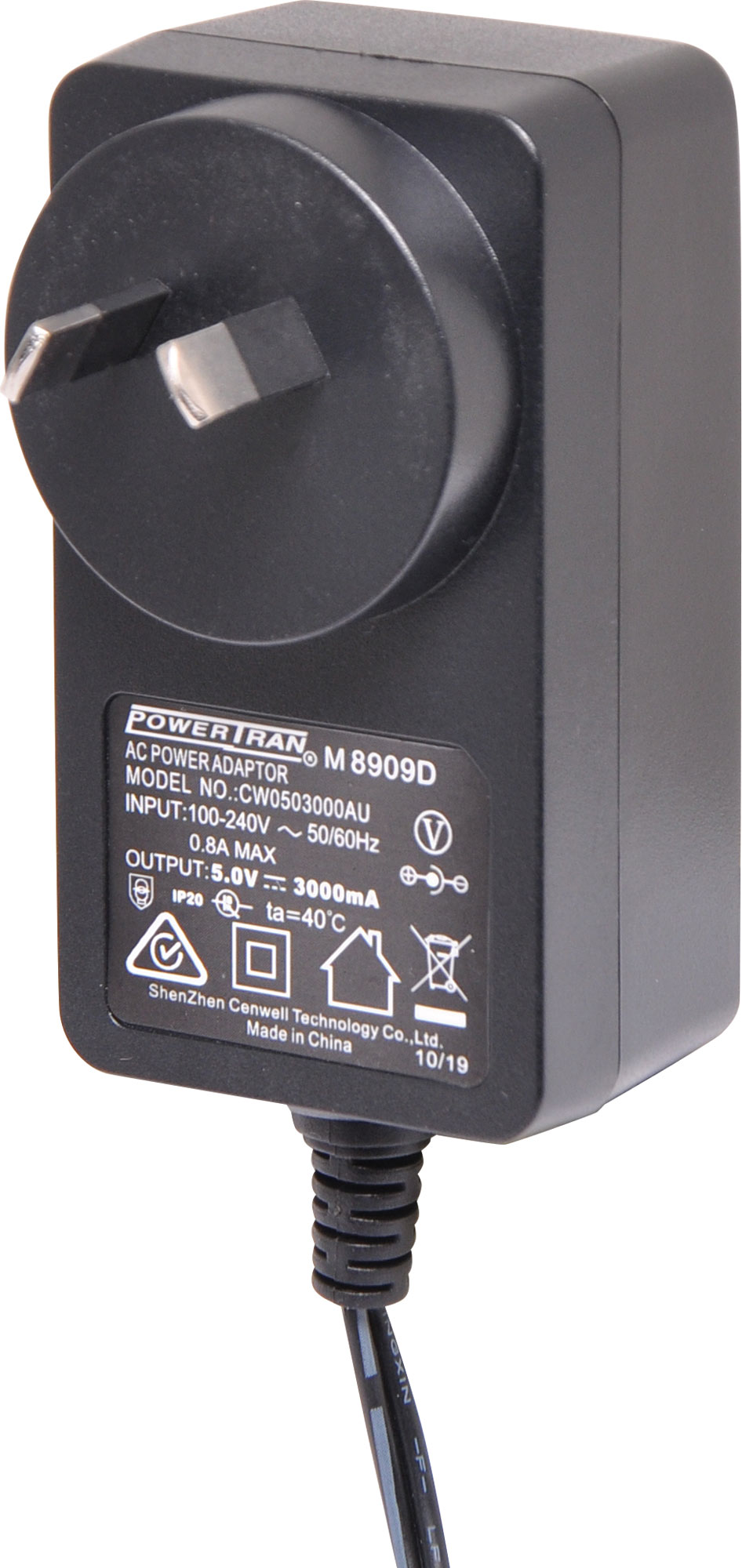 5V DC, 3 Amp switch mode plug pack supplied with a fixed positive to tip 2.1mm DC jack (2.1ID x 5.5OD x 10L). Compact design with high current regulated output. Energy authority approved. MEPS approved.