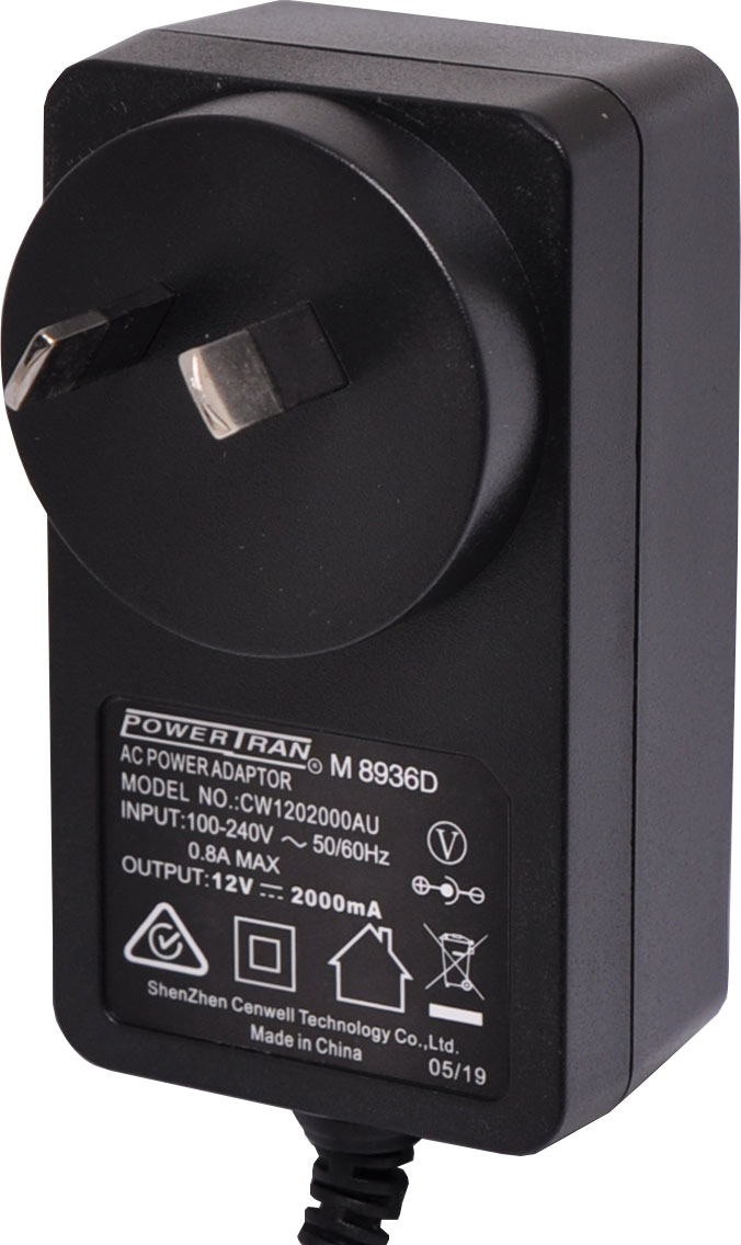 12V DC, 2 Amp switch mode plug pack supplied with a fixed positive to tip 2.1mm DC jack (2.1ID x 5.5OD x 10L). Compact design with high current regulated output. Energy authority approved. MEPS approved.