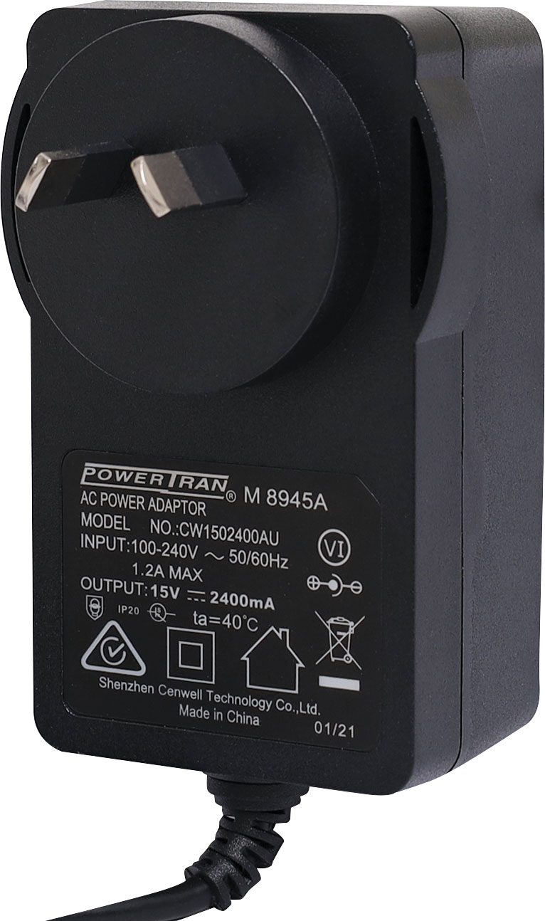 15V DC, 2.4A switch mode plug pack supplied with a fixed positive to tip 2.1mm DC jack (2.1ID x 5.5OD x 10L). Compact design with high current regulated output. Energy authority approved. MEPS approved.