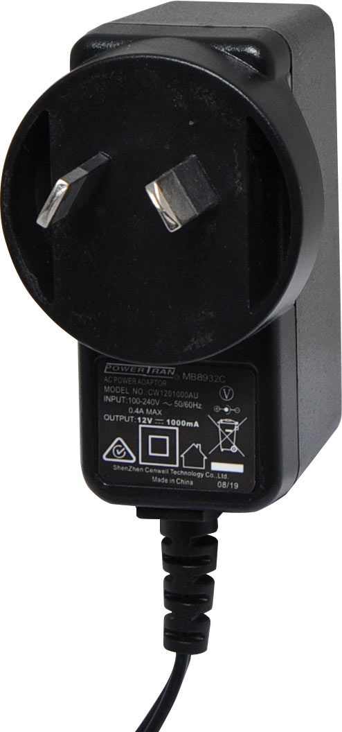 12V DC, 1 Amp switch mode plug pack supplied with a fixed positive to tip 2.5mm DC jack (2.5ID x 5.5OD x 10L). Compact design with high current regulated output. Energy authority approved. MEPS approved.