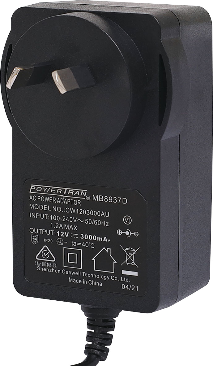 12V DC, 3 Amp switch mode plug pack supplied with a fixed positive to tip 2.5mm DC jack (2.5ID x 5.5OD x 10L). Compact design with high current regulated output. Energy authority approved. MEPS approved.