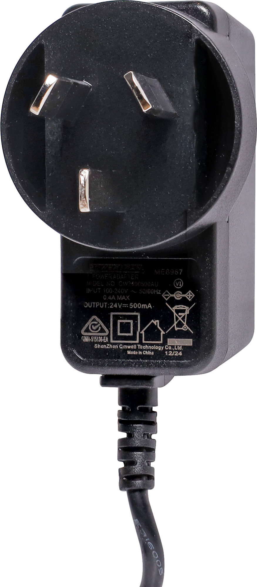 24V DC, 0.5A plug pack supplied with a 3pin earthed fixed positive to tip 2.1mm DC jack (2.1ID x 5.5OD x 10L). Compact design with high current regulated output. Energy authority approved. MEPS approved.