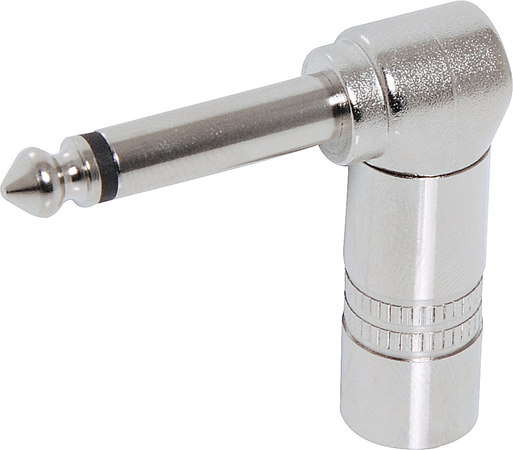 6.35mm Plug 90° Mono. Metal Housing. Accepts up to 7mm OD cable.
