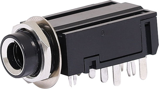6.35mm insulated PCB mount stereo socket with DPDT switched contacts. Mounting hole 11mm dia.