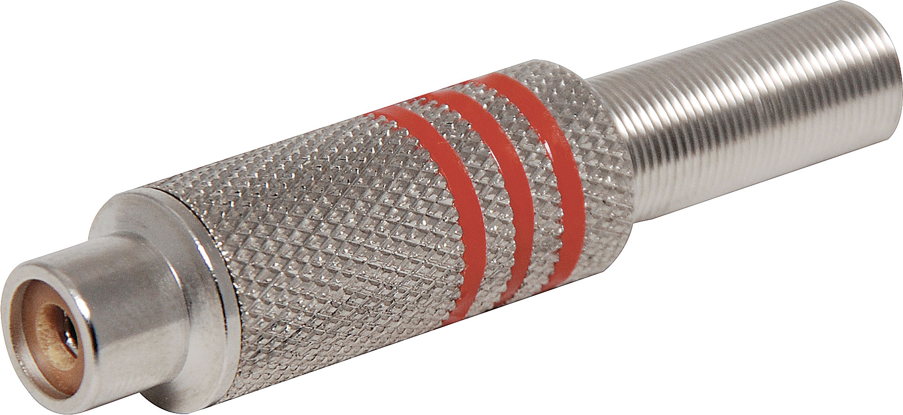 Aluminium plated RCA Line socket with strain relief spring and solder connections. Maximum cable entry size 7mmØ. Red identifying stripe
