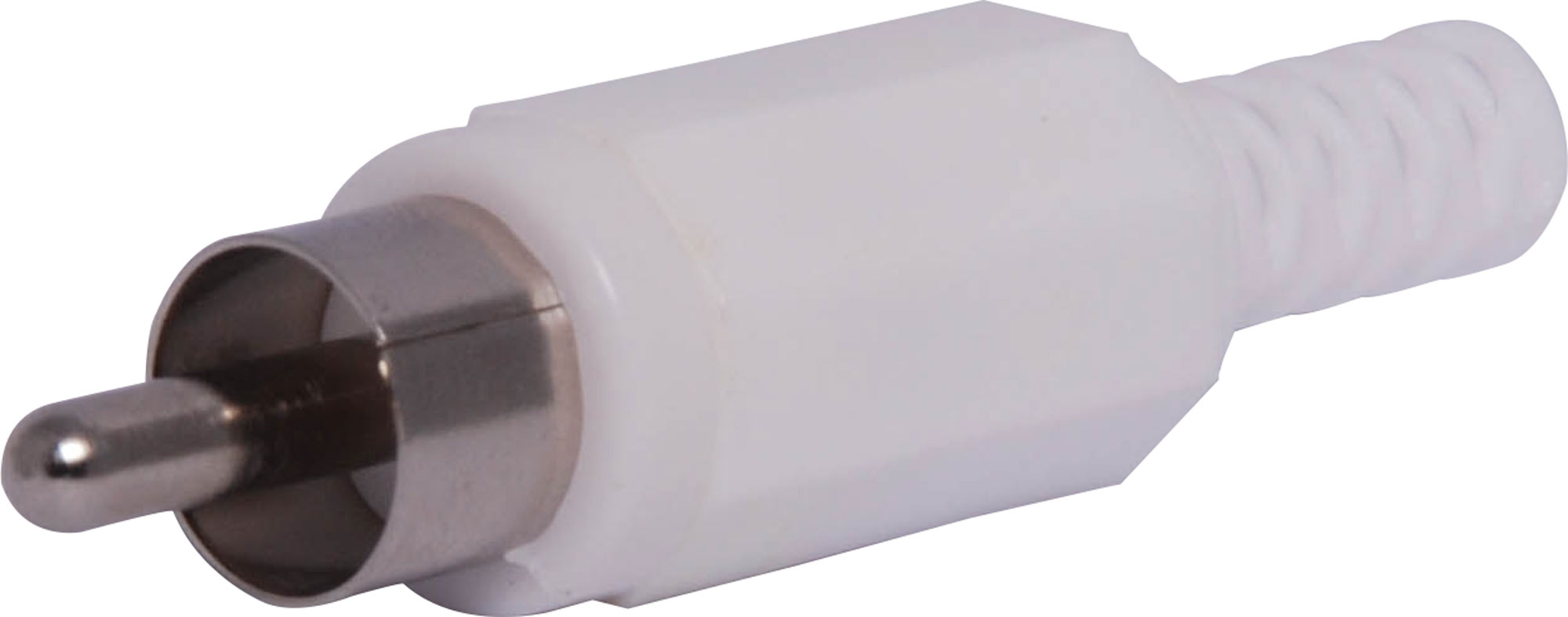 Plastic RCA line connector with strain relief. Maximum cable entry size 5mm Ø. White.