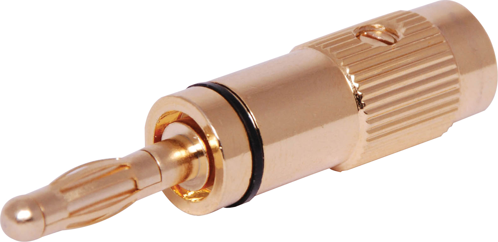 Gold plated banana plug with screw connection for wire termination. 3A @ 125V AC. Black.