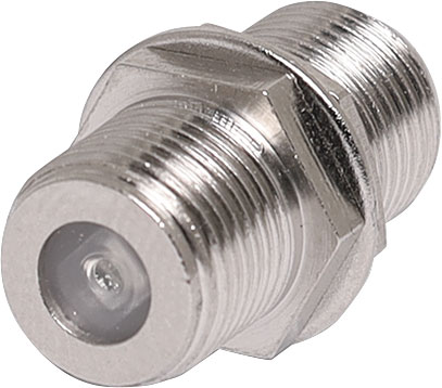 Female to Female F type connector joiner. Threaded type with two nuts for securing to chassis.