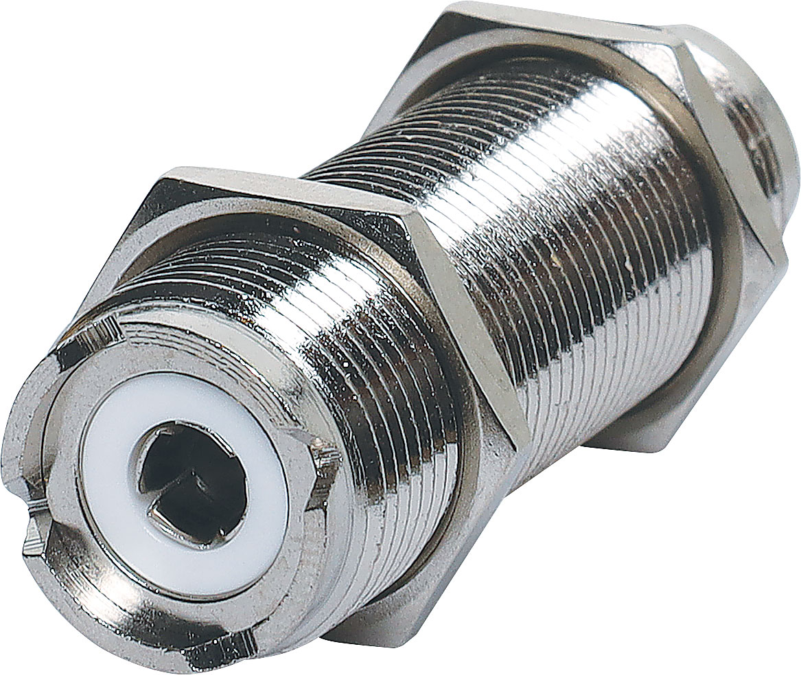 Female-Female, Panel Mount. Mounting Hole 15.5mm Ø. Overall length 45mm. SO239.
