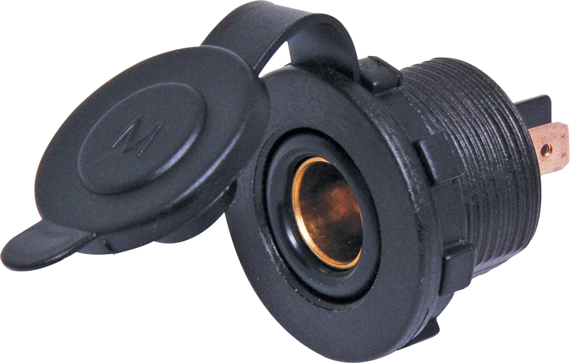 Panel mount Merit DC power socket designed to fit P 0680 or P 0681, but can also be used standalone. 28mm mounting hole. Protective rubber cap. Thread length 16mm. (max thickness).