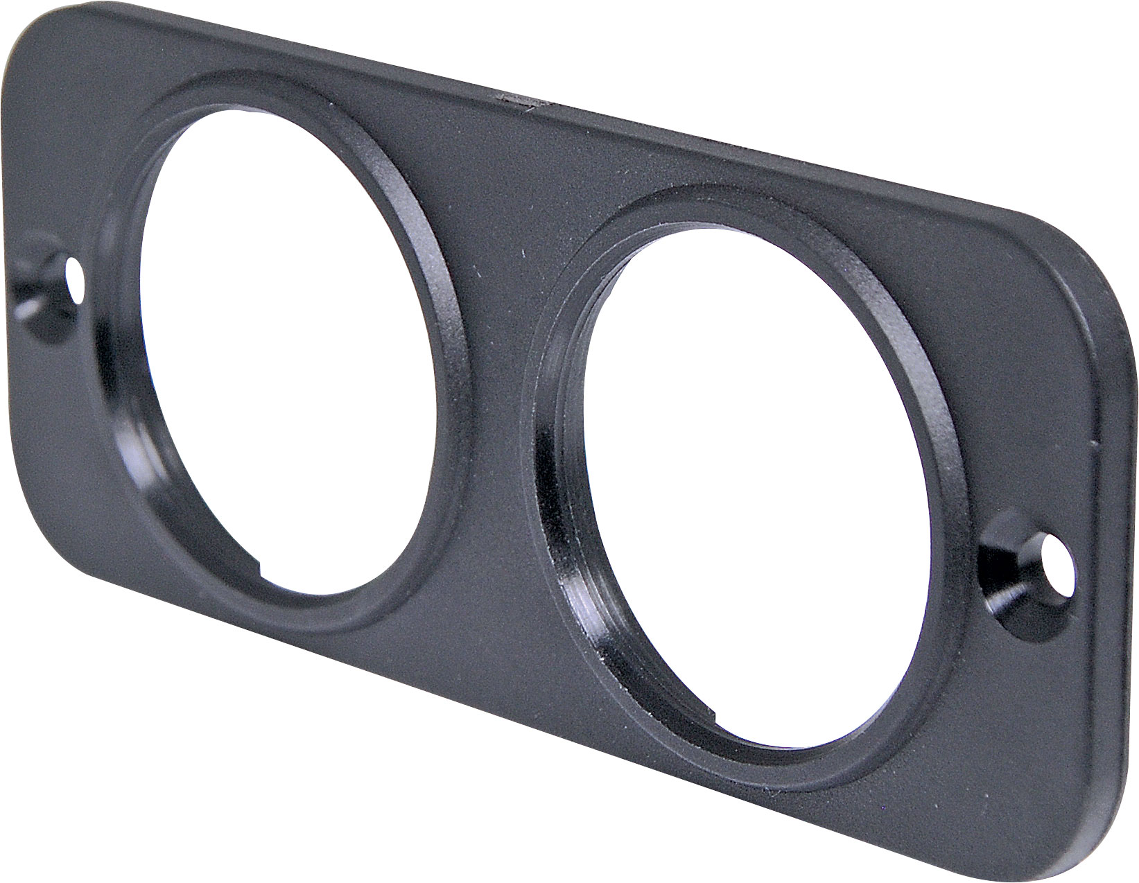 A flush panel mount facia with two holes suitable for mounting P 0675 car accessory socket, P 0677 dual usb charger and P 0672 volt meter. Dimensions L = 106mm H = 43mm D = 5.5mm Main Hole = 34mm Main hole flange = 36.5mm Mounting hole = 4.5mm