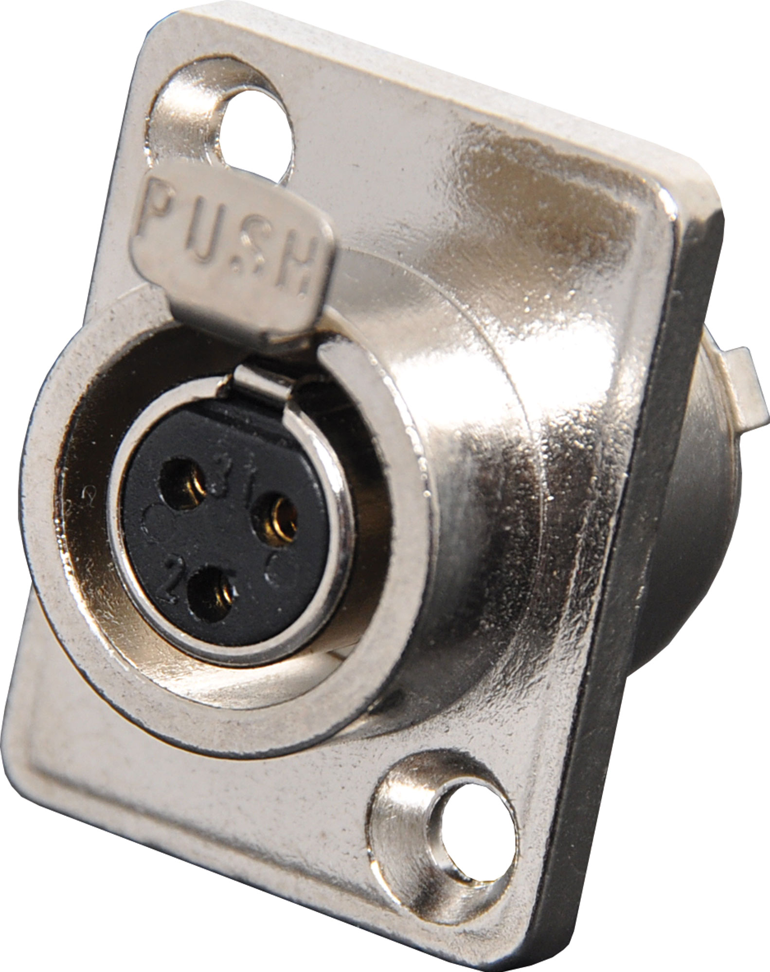 3 pin, chassis mount XLR. Mini version. Female. Mounting hole diameter: 11mm.