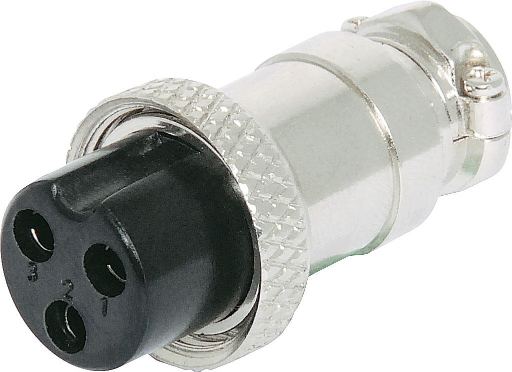 Lockable metal connector commonly used on CB radio microphones. Popular due to their robust construction and the threaded locking collar whch prevents disconnection at inopportune moments. They are also used as a low voltage DC power connector in a range of electronic devices. Mates with P 0954 and P 0944. Female Line Plug 3 Pin Rated 32V DC 10A