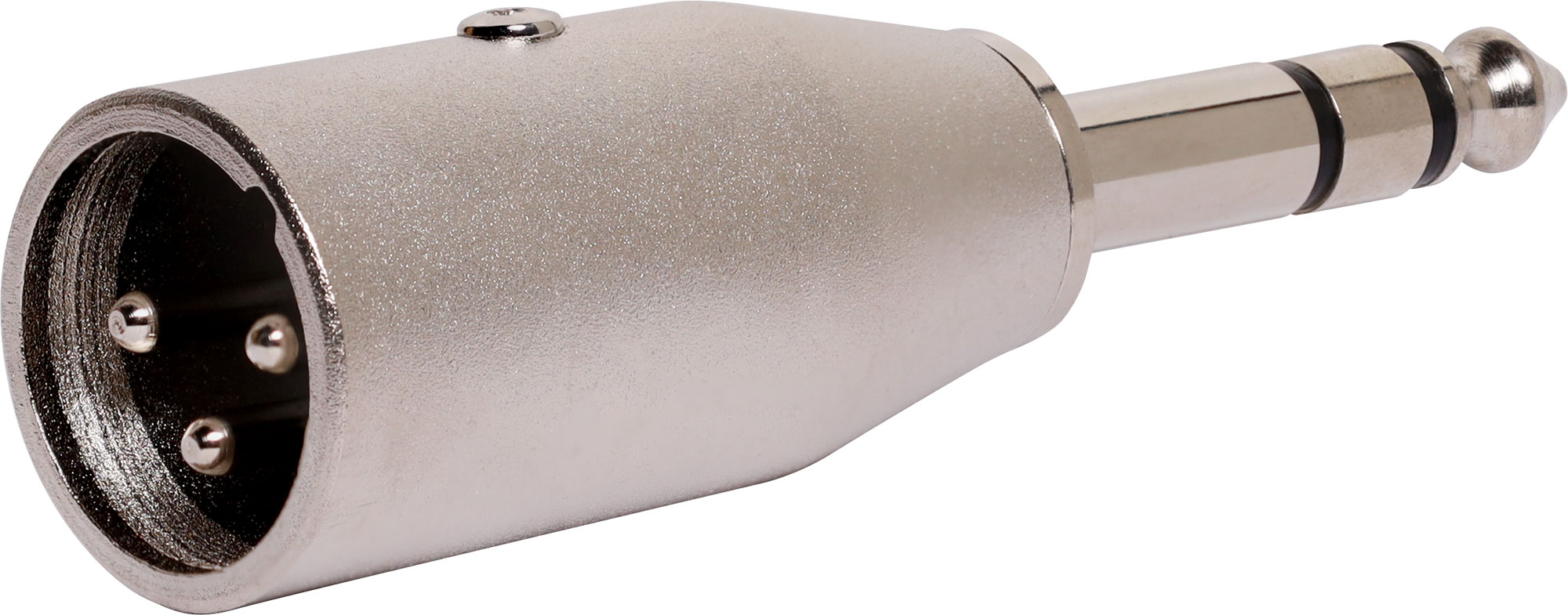 TRS 6.35mm adaptor to XLR 3 pin male. Suitable for balanced signals. Note: this connector allows for TRS jack input, but is designed for balanced signals, not stereo signals. A stereo input will be summed mono output on the XLR side.