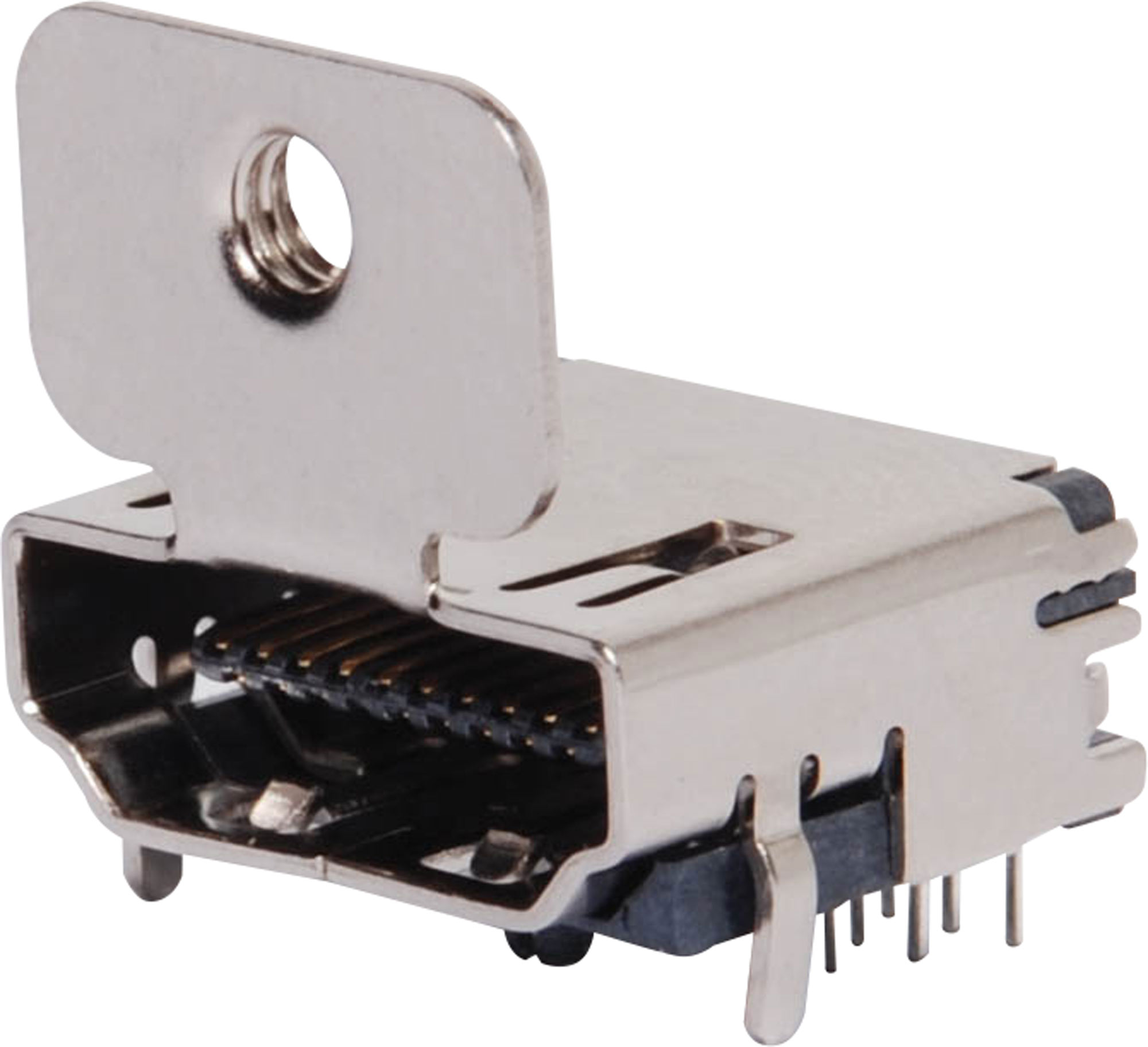 19 pin PCB mount HDMI socket with mounting tab for securing to chassis or wallplate.