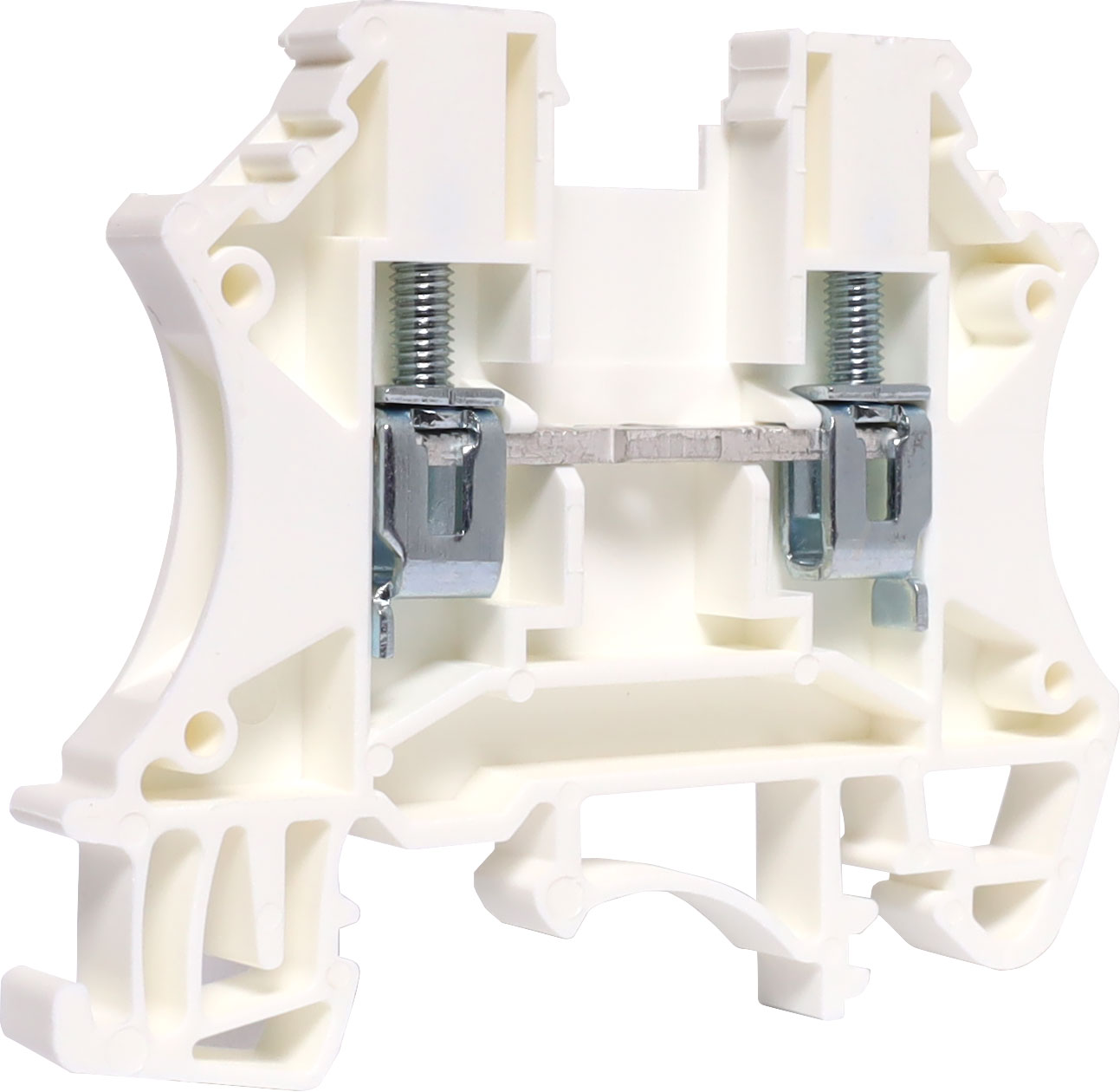 Designed to be ganged together to form as many poles as required to suit your application. Suitable for 2.5mm top hat and asymmetrical “G” Type DIN rail mounts. 600V rated. White.