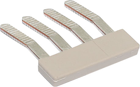 This 4 way insertion bridge allows for the joining of two ganged DIN rail terminals. It inserts below the DIN rail terminal screw cage and distributes the connection to the 3 terminals adjacent. Prongs are scored to prevent dislodgement from the terminal.