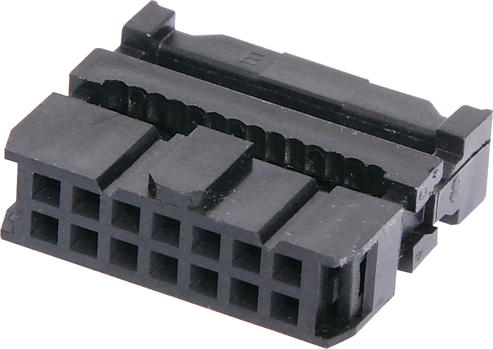 14 pin IDC cable mounting socket. Specifications Contact Resistance: 30M Ohm max @ 100mA DC Insulator Resistance: 1000M Ohm @ 500V DC Current Rating: 1 A Contact Material: Gold plated brass Housing: PBT & 30% Glass Fibre