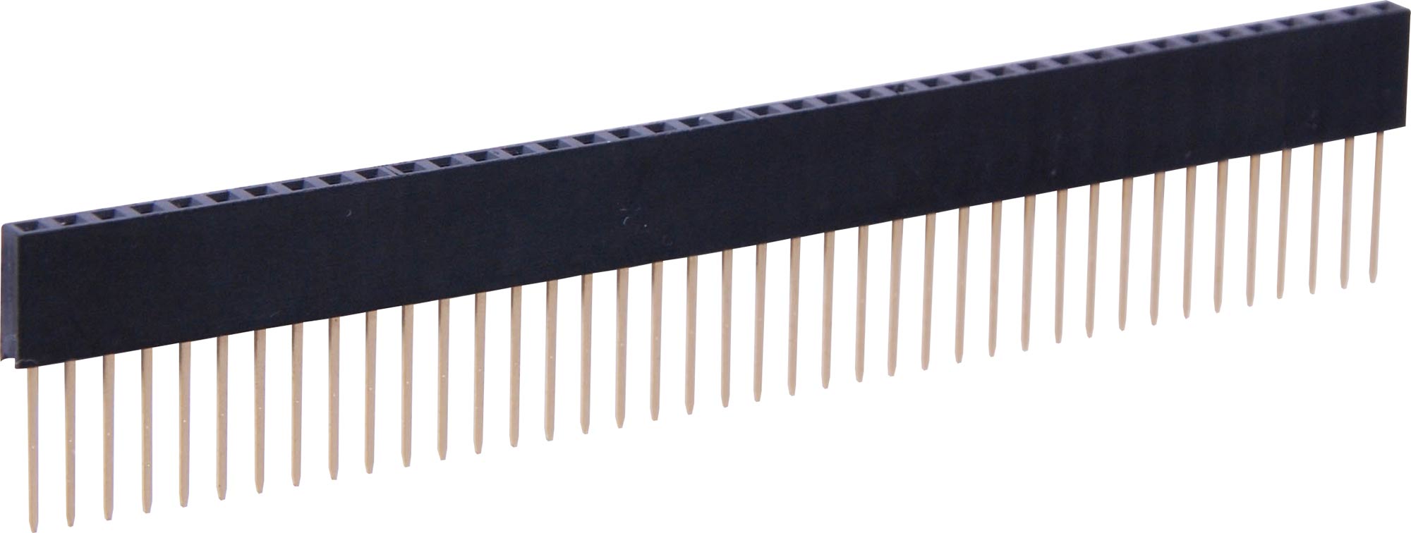 Oupiin 40 way single row header socket for connection to secondary boards with male headers. This model features longer pins for creating stackable PCB designs, such as shields, hats and prototyping boards. 0.1" inch (2.54mm) pitch spacing. Gold Plated Contacts. 8.5mm plastic surround height. Oupiin series 2044.