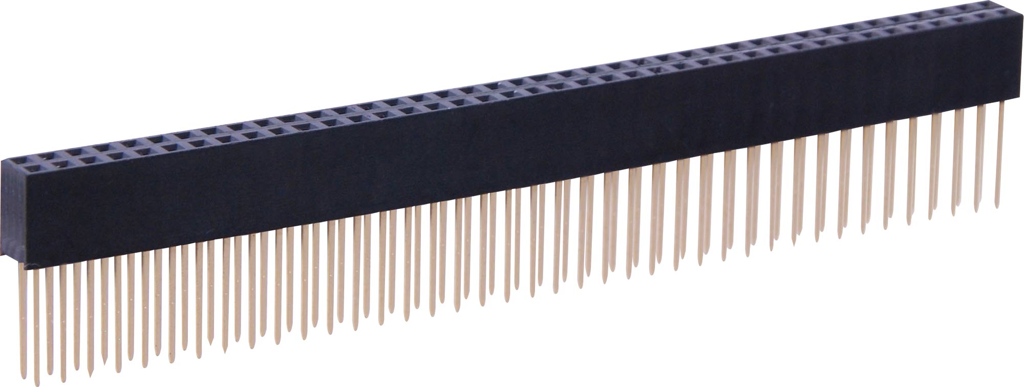 Oupiin 40 way dual row header socket for connection to secondary boards with male headers. 0.1" inch (2.54mm) pitch spacing. Gold Plated Contacts. 11mm plastic surround height. Oupiin series 2044. Cutting to length Whilst these header sockets do not feature ridges for cutting, they can still be cut to length if required. To do so, you will need to sacrifice one pin on the header. Its often easiest if you get a pair of pliers and remove one pin (or pair of pins) from the strip, then cut through the plastic housing with a study pair of wire cutters. Edges can be cleaned up with some precision cutters or a rotary tool with a fine disc. Note that if these headers are placed end to end, the pin spacing will be increased at the join to 2.74mm. The housing can be trimmed with a sharp knife should this solution be required.