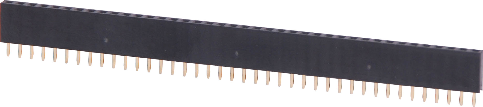 Oupiin 40 way single row header socket for connection to secondary boards with male headers. 0.1" inch (2.54mm) pitch spacing. Gold Plated Contacts. 8.5mm plastic surround height. Oupiin series 2044. Cutting to length Whilst these header sockets do not feature ridges for cutting, they can still be cut to length if required. To do so, you will need to sacrifice one pin on the header. Its often easiest if you get a pair of pliers and remove one pin (or pair of pins) from the strip, then cut through the plastic housing with a study pair of wire cutters. Edges can be cleaned up with some precision cutters or a rotary tool with a fine disc. Note that if these headers are placed end to end, the pin spacing will be increased at the join to 2.74mm. The housing can be trimmed with a sharp knife should this solution be required.
