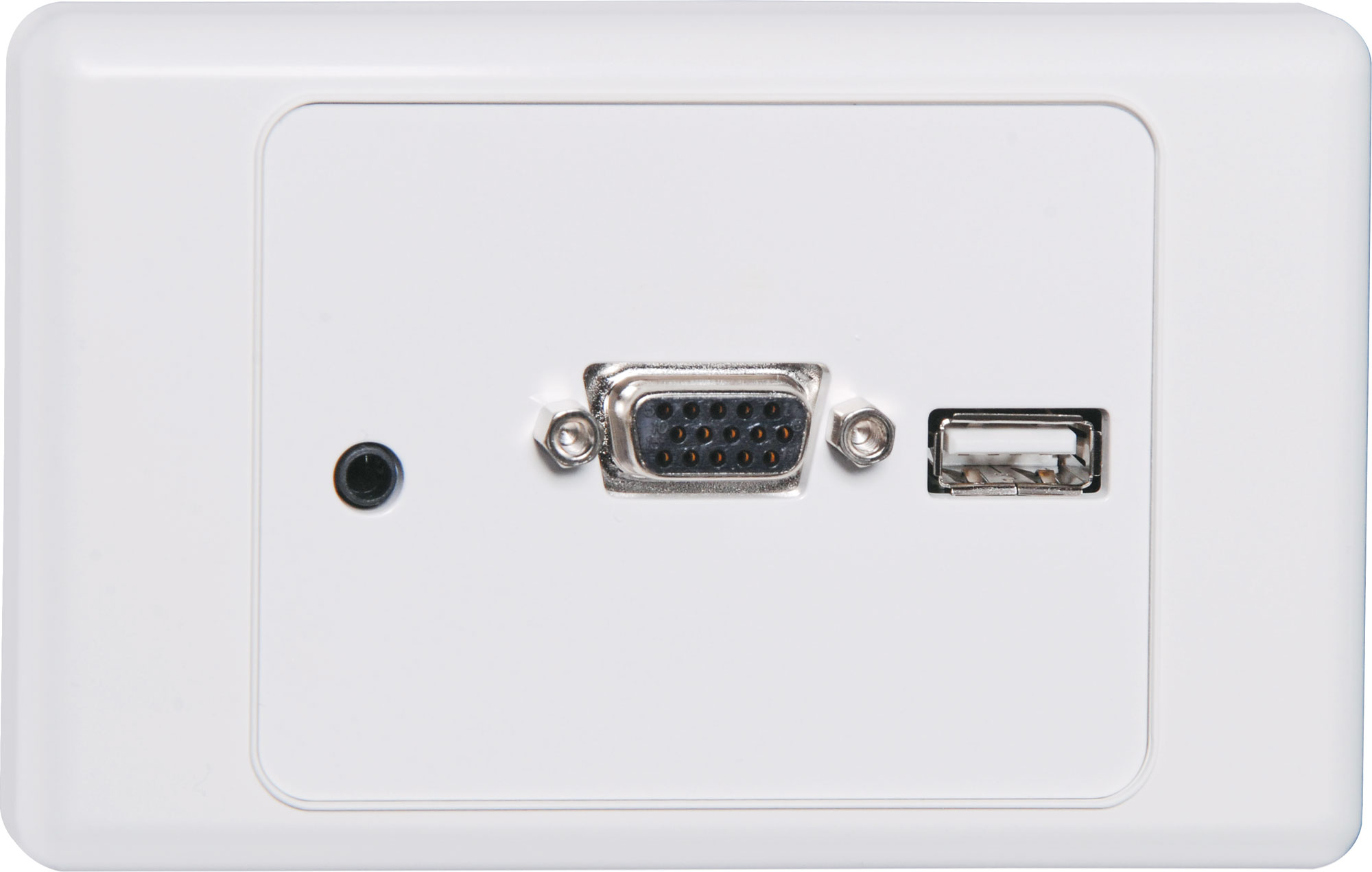 Wall plate fitted with VGA, 3.5mm audio & USB connector. Rear connections for VGA and 3.5mm audio are via screw terminals. Altronics dual cover type wallplate. Pinouts: Lower row: pins 1-9 Upper row: pins 10-15, pin 16 Common, pin 17-18 L-R audio. All wall plates assembled by Altronics are supplied with two facia clip on covers. These are designed to match your current decor. Simply clip on the desired cover after installation.