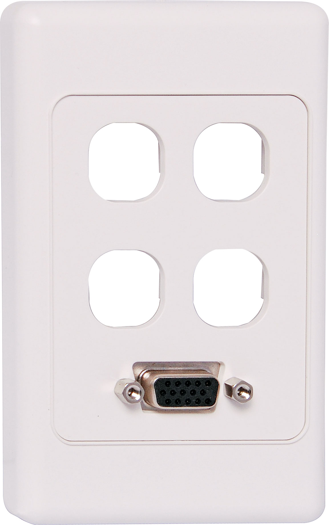 Screw terminal type VGA plates are fitted with HD9 female VGA connector and 4 blank mech spaces for individual configuration. Includes PCB mounted HD9 female VGA connector for easy on-site termination. Altronics dual cover type wallplate. Suitable for Clipsal® mechanisms. All wall plates assembled by Altronics are supplied with two facia clip on covers. These are designed to match your current decor. Simply clip on the desired cover after installation.