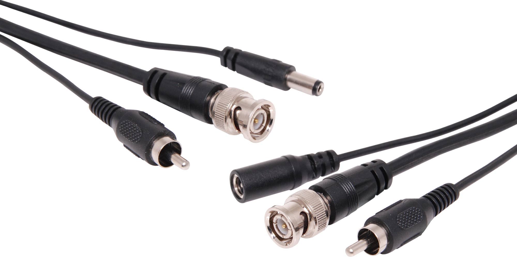 This CCTV Camera Extension Cable can save you time and money by running power, audio and video to your cameras in a single cable run. 5m length. 2.1mm DC power, RCA audio, BNC video. The impedance rating for the BNC wire is 75 Ohm.