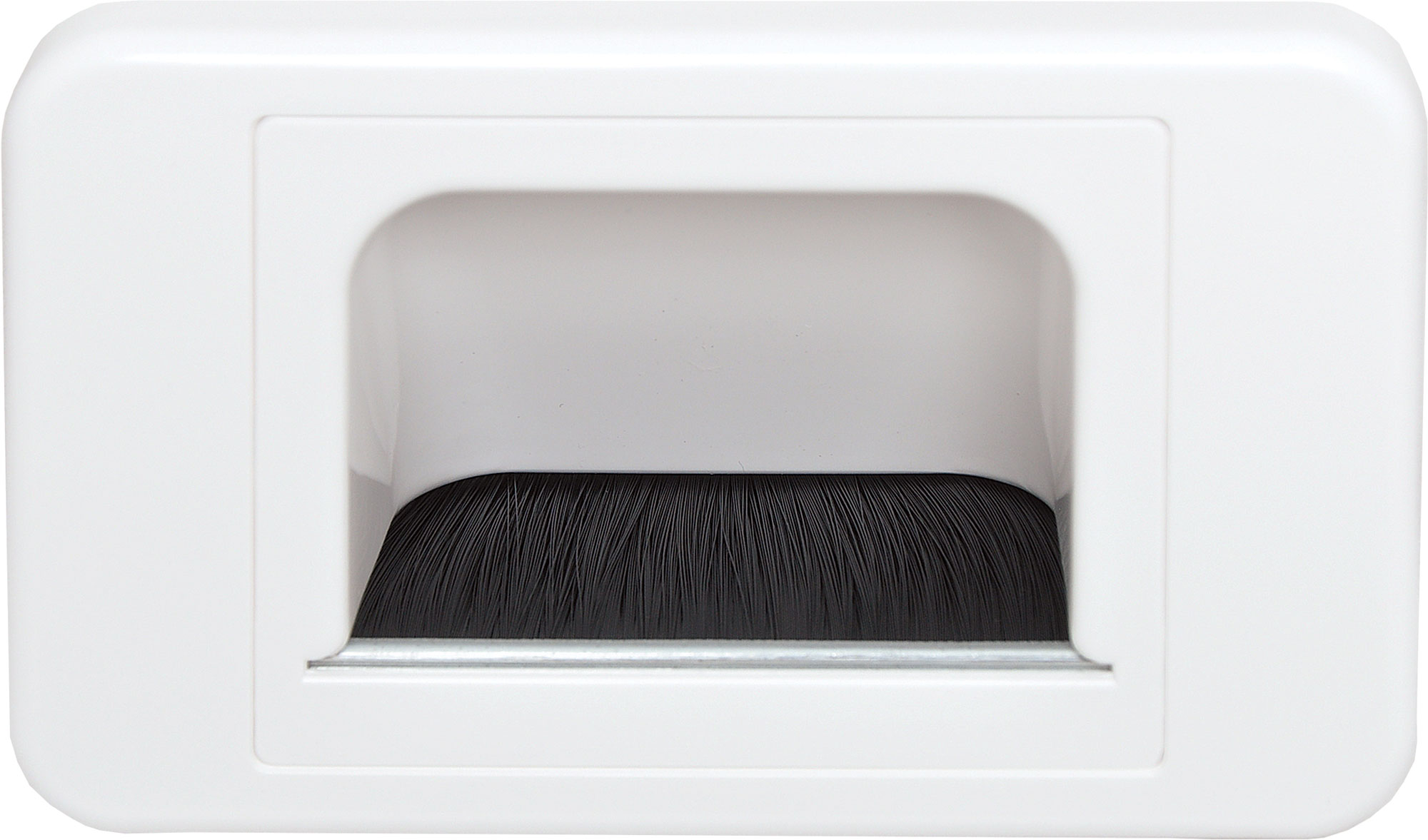 Formerly called a reverse bullnose wall plate, this unique wall plate is for use with minimal wall clearance, such as behind cabinetry. Allows multiple leads to pass into the cavity without termination. Curtain prevents dust ingress. 27mm cable opening.