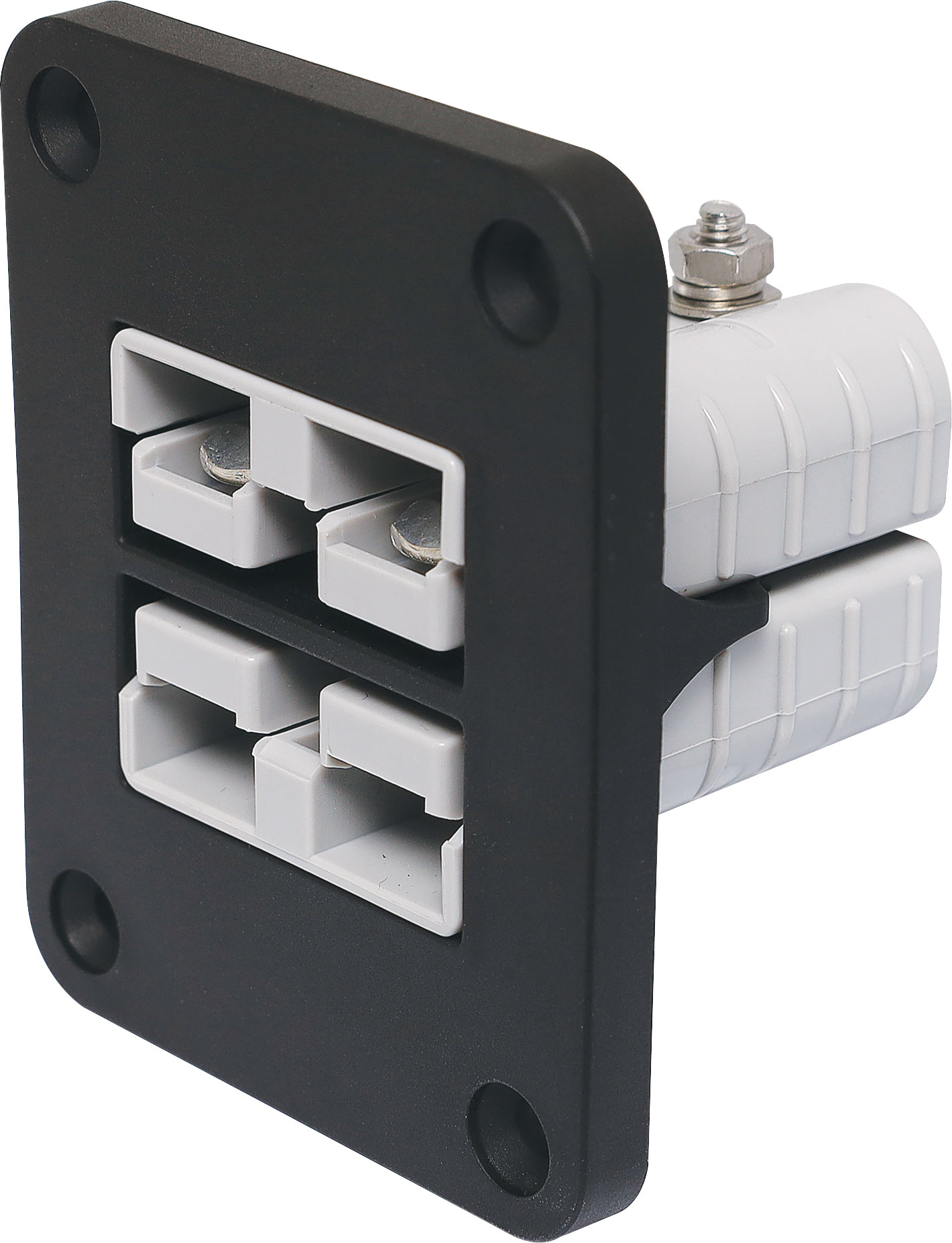 This Anderson Style connector features an enclosure for panel mounting into vehicle cabinets or bodywork. Provides easy connection to solar panels and auxiliary batteries/appliances utilising 50A Anderson connection. Includes two connectors & lugs.