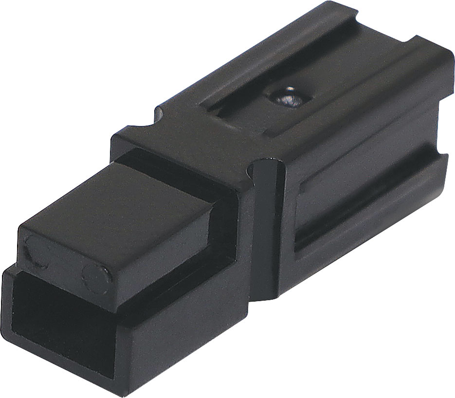 Anderson PowerPole style DC 600V connector (not genuine). As used in automotive and industrial applications. Can be dovetailed together for multi-pole connectors. 30A rated. Sold individually. Supplied with connector housing and crimp lug. Colour: Black Cable Entry: 2.75mm Max Insulation Diameter: 4.45mm Dimensions: 25.5L x 8.44H x 8.44W