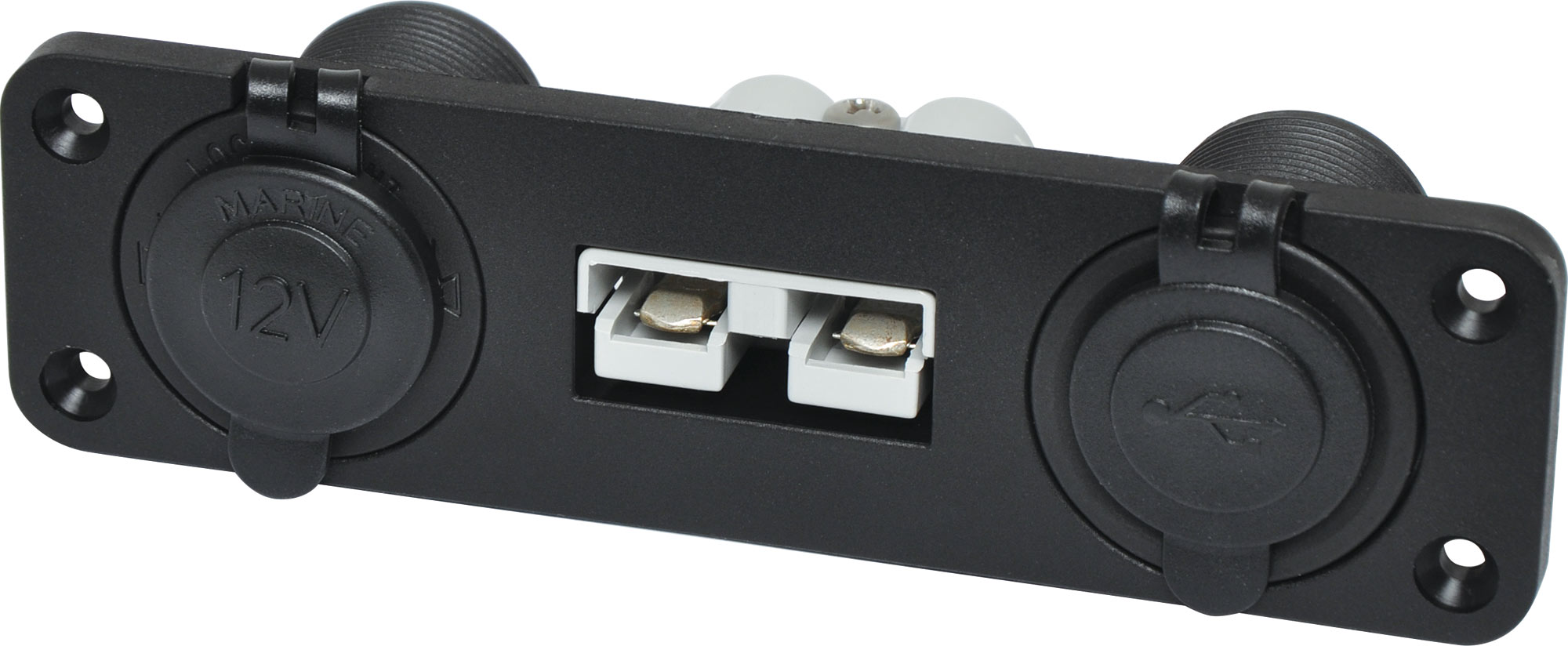 This Anderson Style connector features a fascia plate for flush mounting into vehicle cabinets or bodywork. Provides easy connection to solar panels and auxiliary batteries/appliances utilising 50A Anderson connection. This connector also features a car accessory ideal for charging compatible devices. Also features 2 USB ports; 1x 5V 1A and 1x 5V 2.1A, ideal for charging phones, tablets etc whilst users are travelling. Dimensions: Mounting hole size: 126x30mm Overall Depth: 42mm External Dimensions: 42x151mm