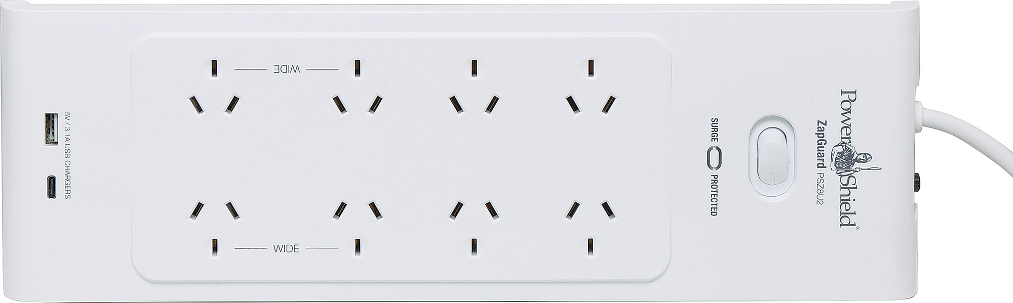 The ZapGuardยฎ PSZ8U2 Surge Board will protect your home and office electronics from dangerous surges and spikes and is ideal for charging mobiles, laptops and other small USB powered devices. It is highly rated to withstand power surges and spikes of up to 2,100 Joules / 60,000 Amps. It features a wide spaced socket to allow for plug packs and also has the option to be wall mounted.