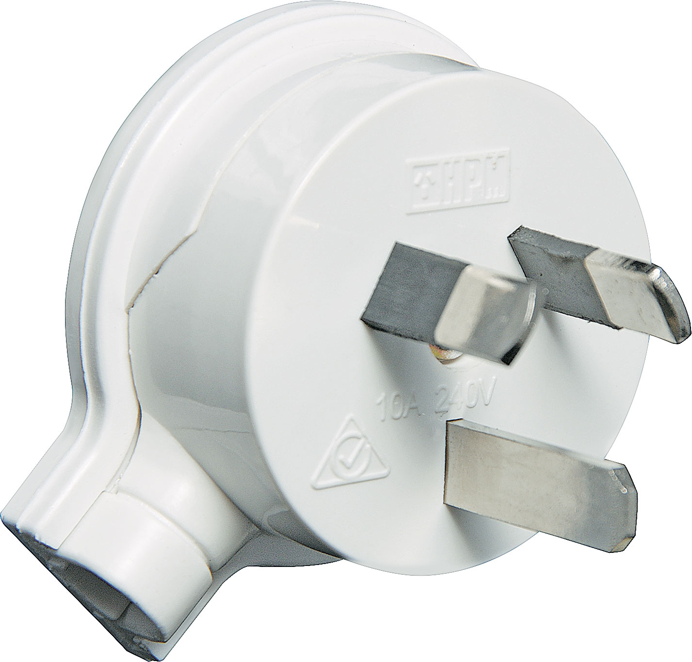 Garden variety Australian 10A rated white side entry line 240V mains plug. Handy replacement for worn out lamp lead ends. Fully approved for indoor use. HPM brand.