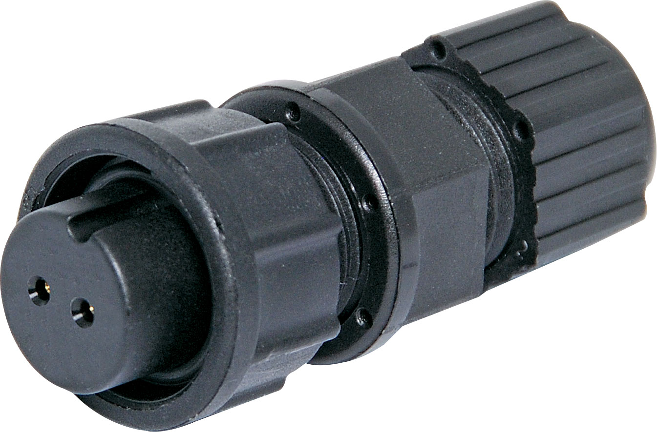 Waterproof IP67 rated 2 Pin Female Line connector for installations outdoors or in areas prone to moisture build up. Lock Type mating ring. 5A rated. See accessories for mating connectors and suitable cap