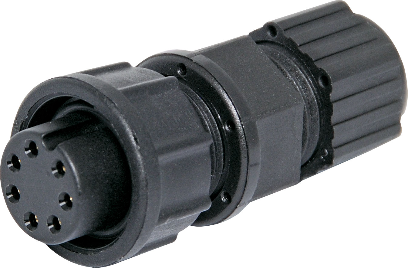 Waterproof IP67 rated 7 Pin Female Line connector for installations outdoors or in areas prone to moisture build up. Lock Type mating ring. 5A rated. See accessories for mating connectors and suitable cap
