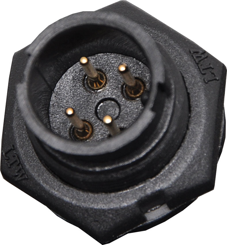 Waterproof IP67 rated 4 Pin Male Chassis Mount PCB Connector. Lock type mounting ring. See accessories for mating connectors and suitable cap