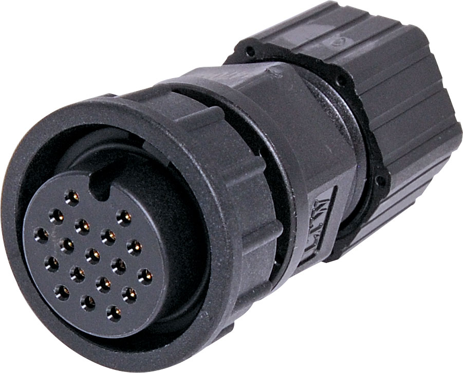 Waterproof IP67 rated 18 pin line connector for installations outdoors or in areas prone to moisture build up. 5A rated.