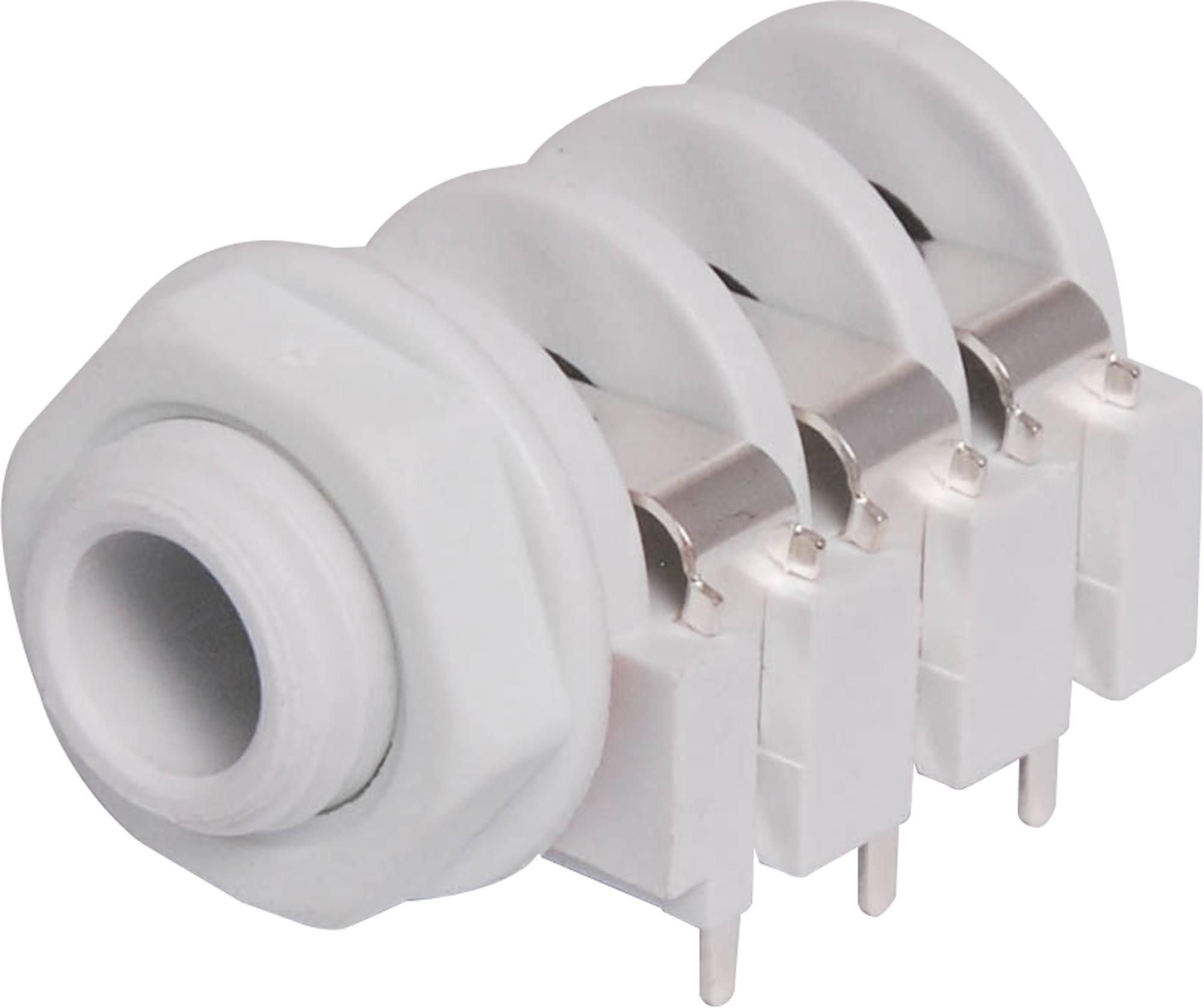 6.35mm PCB mount stereo socket with 3PST switched contacts. Insulated from Chassis. Mounting Hole 11mm