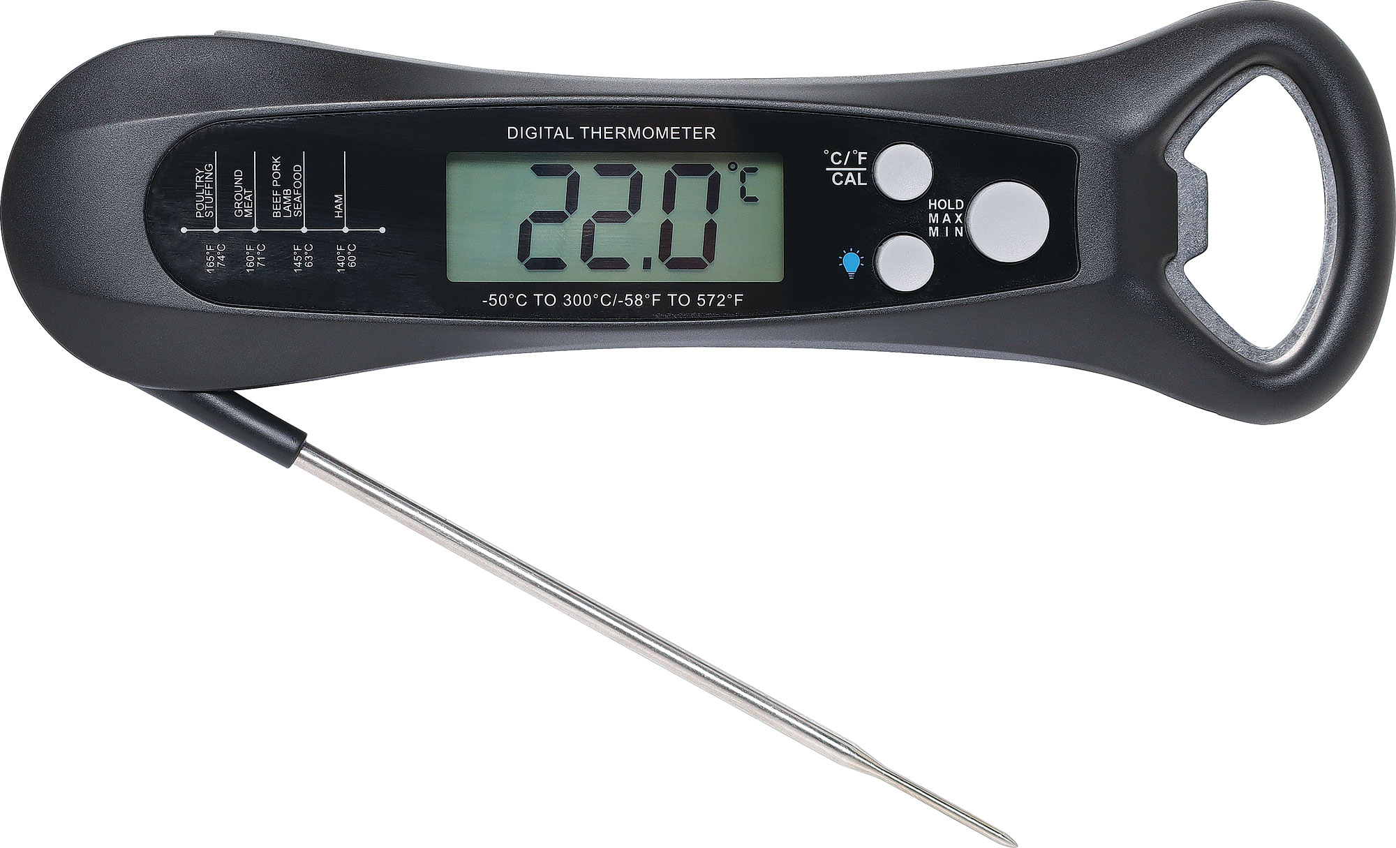 A handy fast reading digital thermometer suitable for a wide array of uses such as monitoring liquids in laboratory, kitchen or BBQ use - great for roasting meats; home brew setups and more! Stainless steel probe can be wiped clean after use. Includes min/max function. °C or °F measurement. Min/max hold. Auto power off. -50°C to +300°C . Includes 3V button battery.