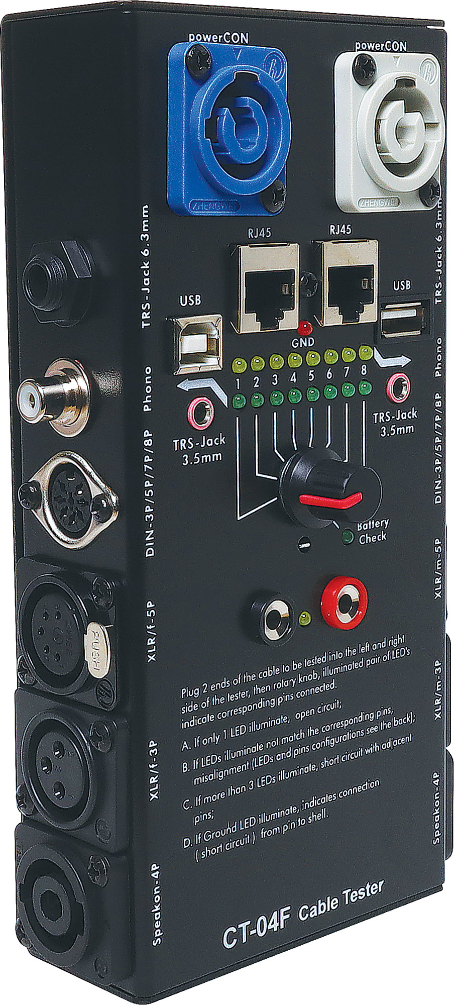 Compatible with 3.5mm jack, 6.35mm jack, 3/5/7/8 pin DIN, RCA, 3/5 pin XLR, 4P Speakon, Powercon, banana plugs, RJ45 and USB. A quick and easy way to confirm lead integrity. Constructed from a steel case it is built to withstand the rigours of professional use. Equally suited to AV & PA installers. An invaluable tool for checking leads in an instant. Requires 1 x 9V battery (sold separately)