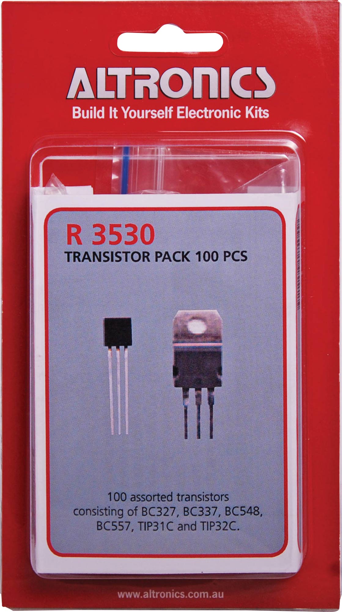A packet of 100 pieces of common variety transistors. T-0220 and T-092 packages, PNP and NPN types Pack includes: BC327 PNP 20pcs BC337 NPN 25pcs BC548 NPN 25pcs BC557 PNP 20pcs TIP32C PNP 4pcs TIP31C NPN 6pcs